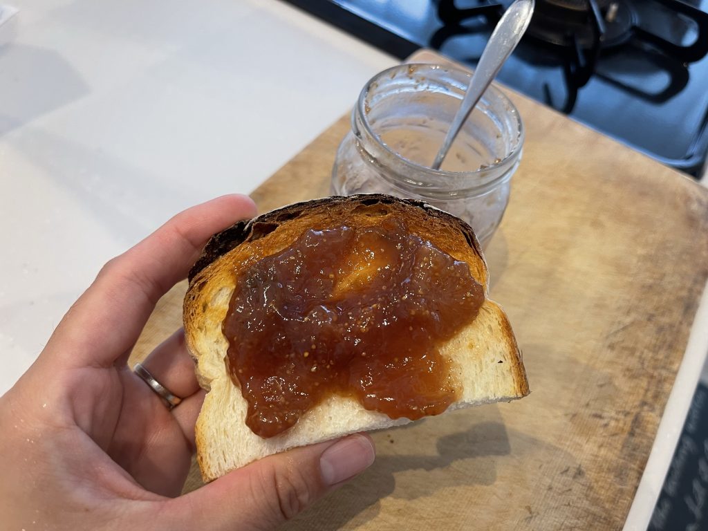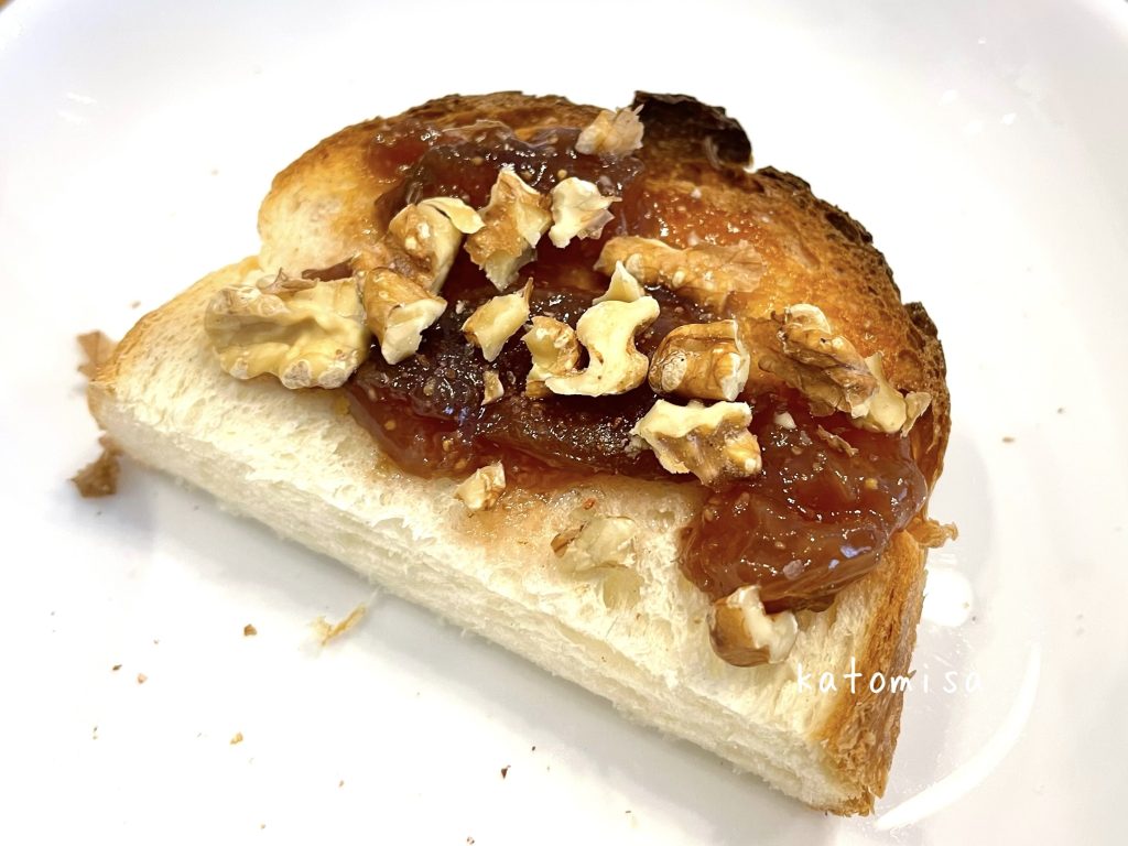 食パン半分をこんがり焼き(私はいつもおかずいっぱいに食パン半分を楽しんでいる)、いちじくジャムをたっぷりと塗る。手で粗く砕いた2-3粒の胡桃を散らし、岩塩をガリガリかければ出来上がり。