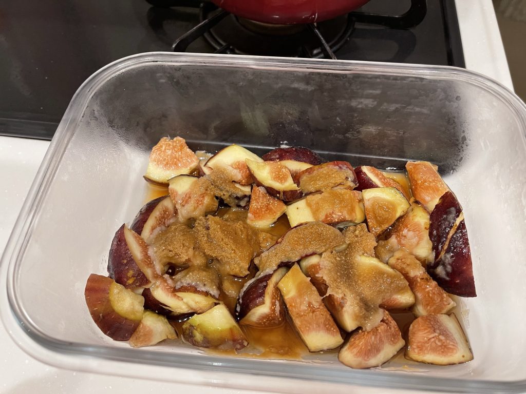 まずはいちじく(無花果)から水分を出していきます。煮詰めるときにお水を使わずに作る方法なので、この果肉から出てくる水分がとっても大事。無花果のヘタを取り、ざく切りにします。容器にいちじくを敷き詰めたら、砂糖をまぶし、1-3時間ほど放置します。私の場合、ゆっくり待てる余裕はないので前日の夜にこれを仕込み、冷蔵庫へ。