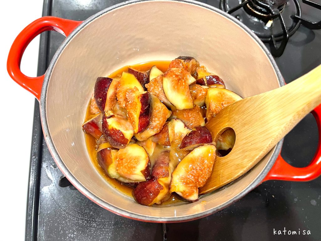 時間を置いたあと、いちじくを煮詰めます。前日の夜に仕込んだ私は、翌朝強火でコトコト、木べらでかき混ぜながら煮詰めて完成です。途中、白っぽい泡(あく)が出てきたら、スプーンですくい取ればOK。