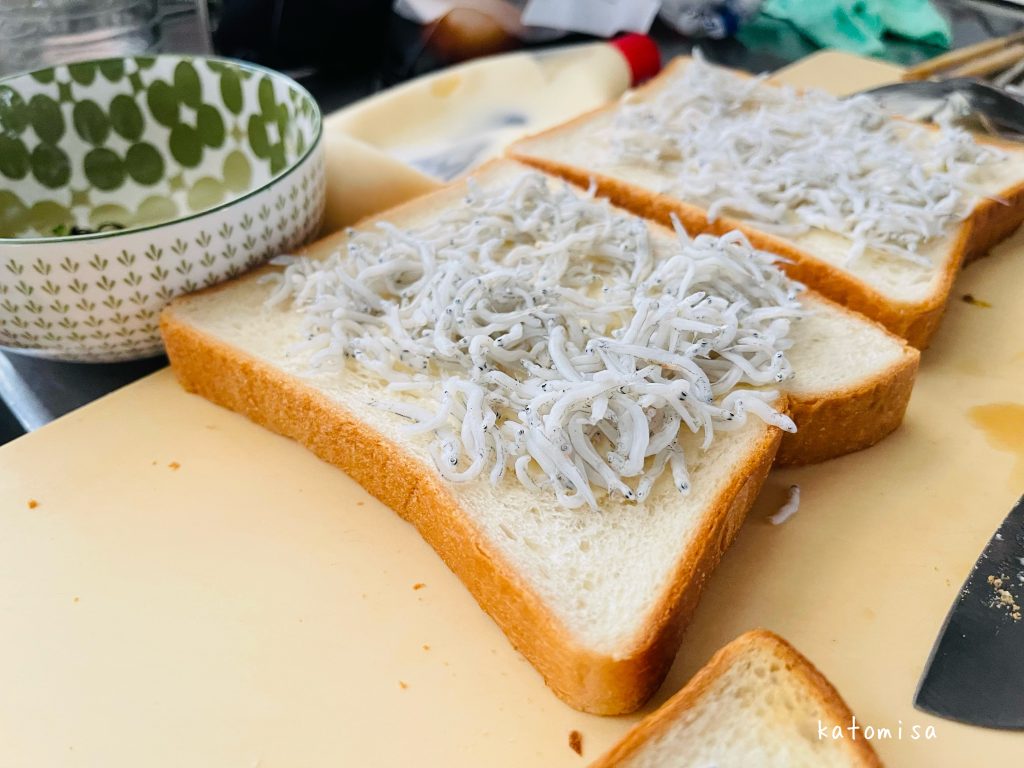 生しらす乗っけパン、シンプルだけど栄養価も高いので子供の朝食にもおすすめです。