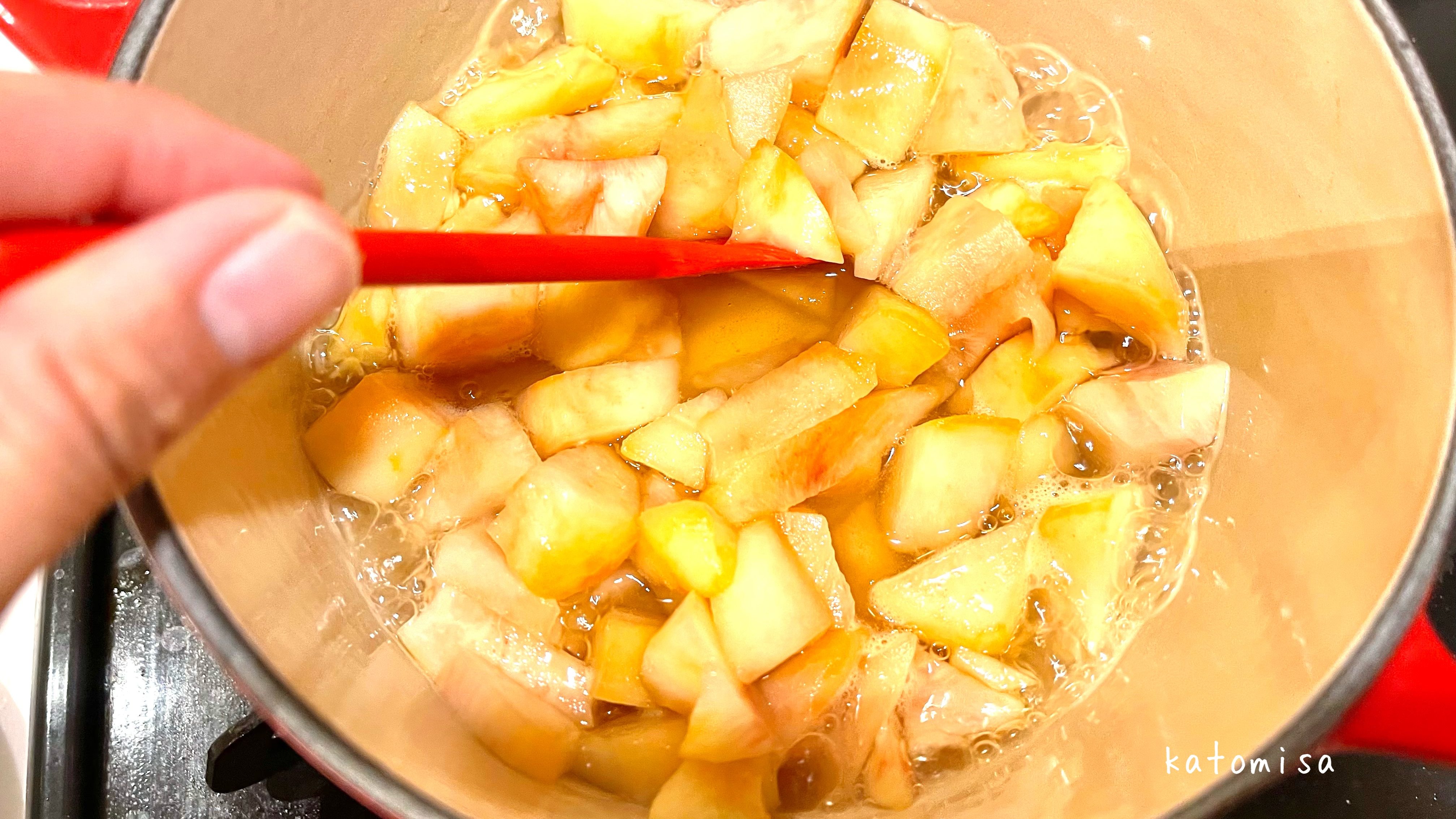 お砂糖は少なめなので、ジャムのような粘り気は出ないと思います。表面がすこしツヤっとして、なんとなく缶詰の桃のシロップのようなとろりとした感覚が見えてきたら完成です。