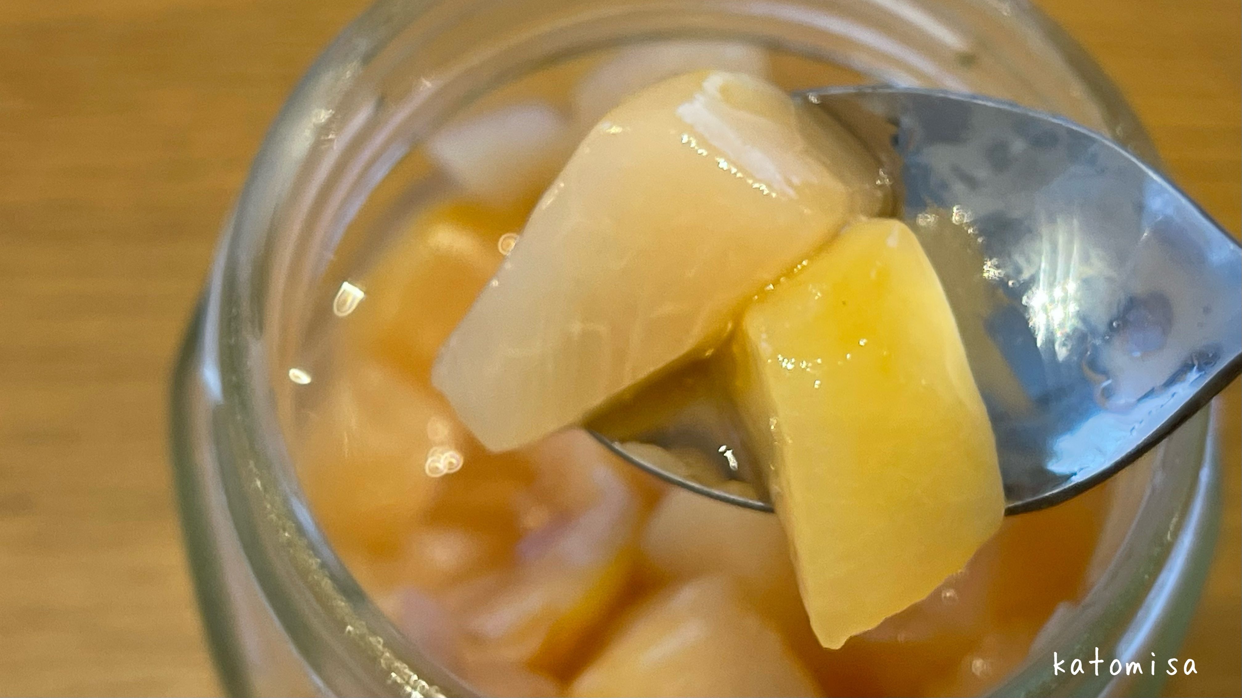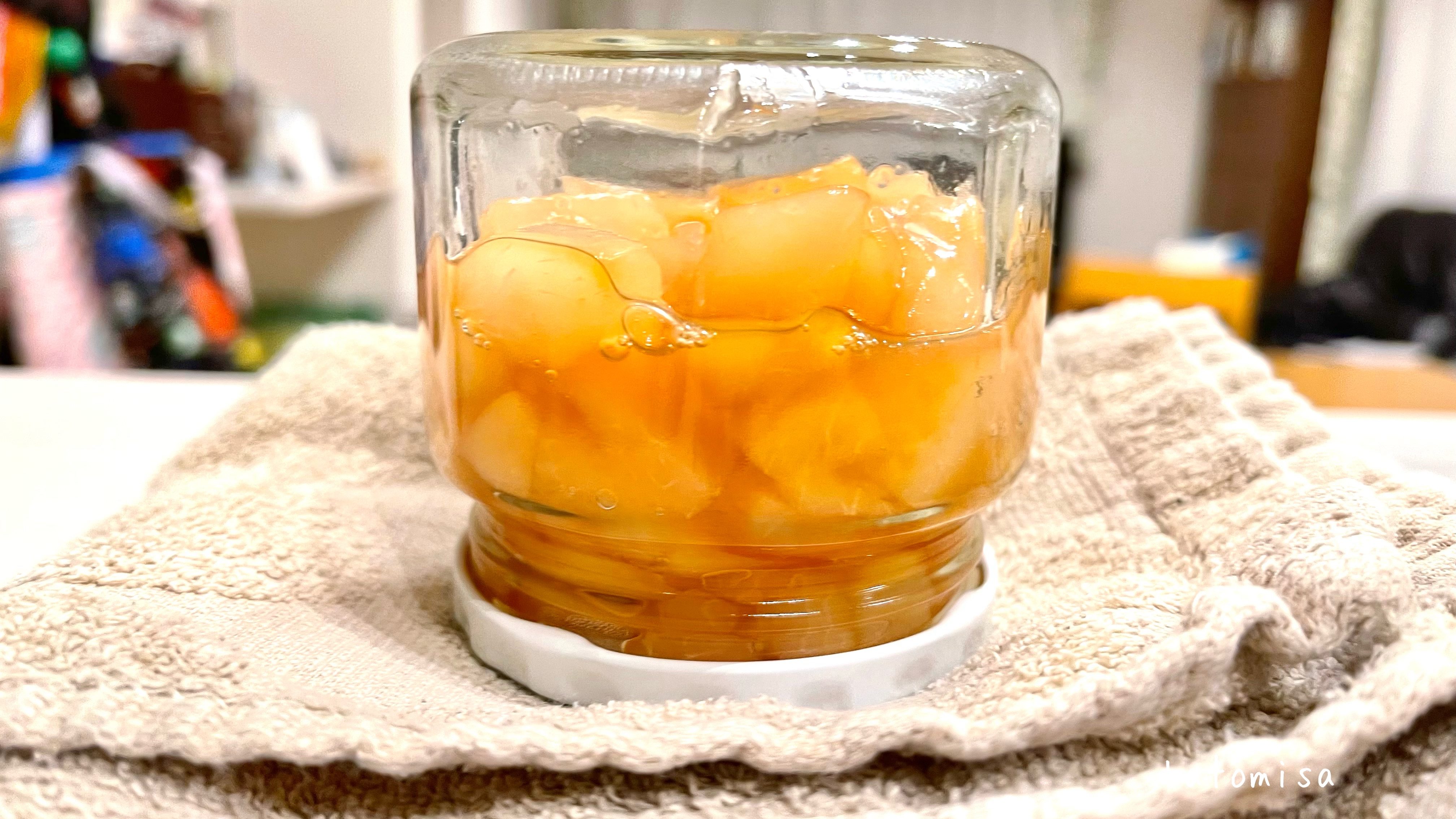 今回は完熟前の白桃を使ったので、缶詰の桃のようなショリショリした食感も楽しめました。スーパーなどで買ったけれどちょっと早かったなぁ、という時期にもこれなら長く楽しめます。